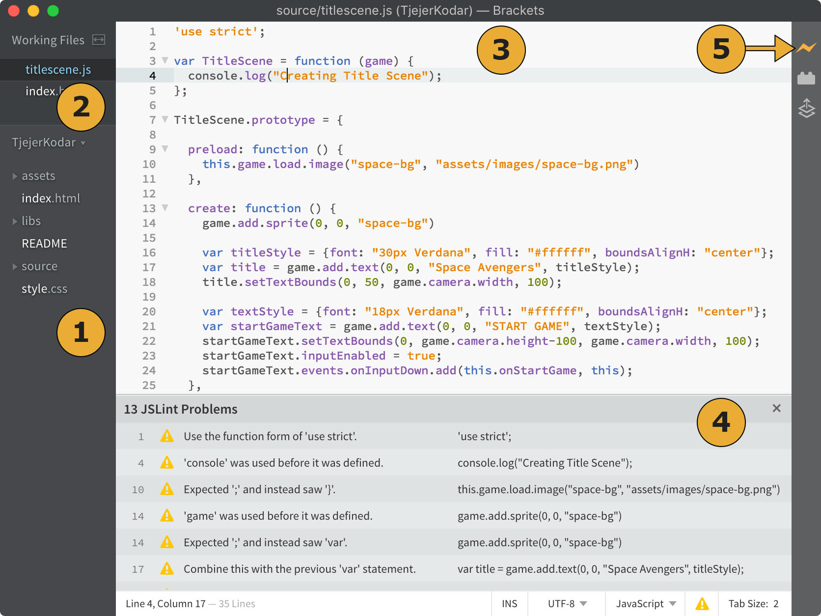 Live Preview: This button is incredibly useful for us! It will open up the current project in Google Chrome and let you preview your game. What makes Brackets special is that “Live Preview” actually runs a tiny web-server on your computer and the page you see in Google Chrome will look exactly the same as it will when published on the web.