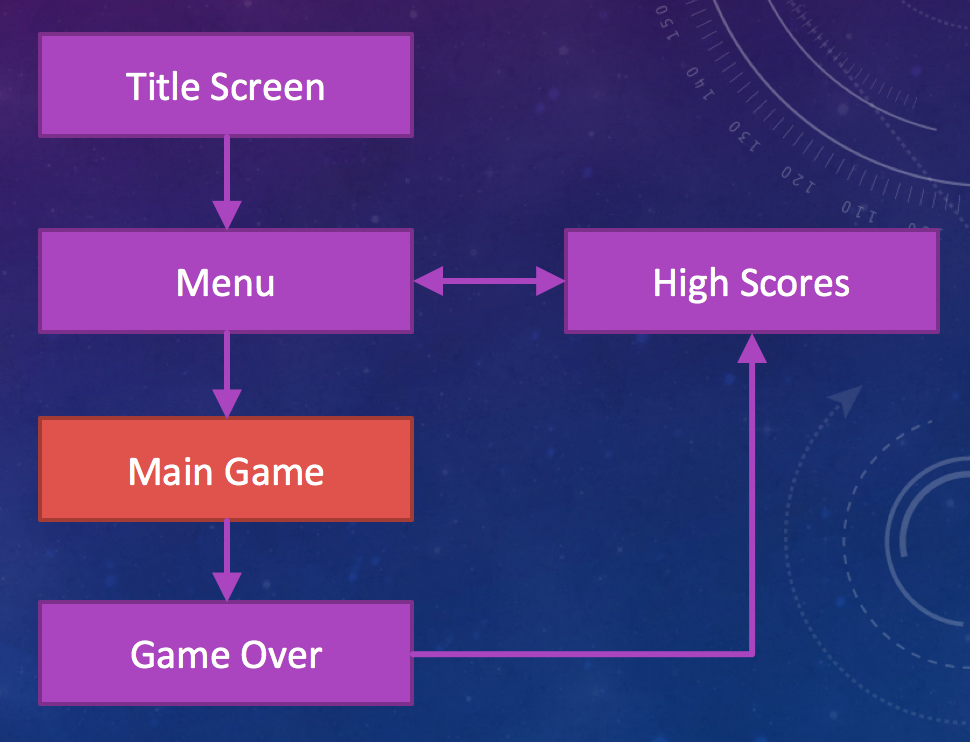 For our purposes, we only need one state for now - the game itself. You might later find yourself adding additional states (a Game Over screen for instance), but for now - we just want to get on with making the game prototype! As such, we will just have one ‘state’ or ‘scene’ and that will be the gameplay itself.