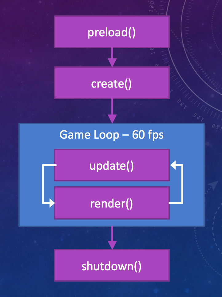 create: Phaser will call ‘create’ after calling preload, but still while creating your scene. This is where you can place objects in the scene or setup a user interface before the scene is shown to the player.